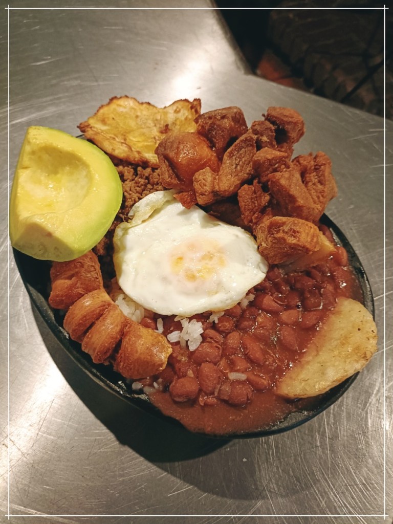 Bandeja Paisa is a traditional Colombian dish that contains beans, rice, arepa, traditioinal chorizo, plantain, chicharrón, avocado and marinated ground beef (like arroz cubana). I’ve noticed that Latins serve avocado as a side without any sweeteners; in contrast to us who only appreciates the fruit when it’s sweet and creamy.